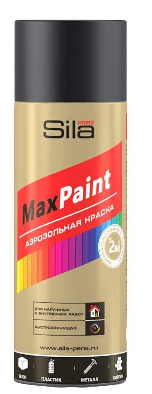 Аэрозольная краска для защиты, декорирования и реставрации большинства поверхностей. Аэрозольная быстросохнущая краска Sila HOME Max Paint - это универсальная акриловая краска в баллончике для декоративного окрашивания предварительно загрунтованных металлических, деревянных, пластиковых, кирпичных и бетонных поверхностей.